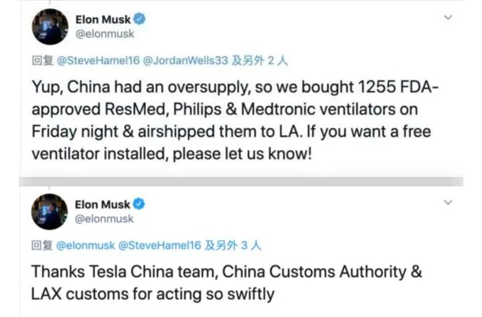 马斯克兑现了在本周内提供至少1000台呼吸机的诺言——他从中国购买了1255台呼吸机。