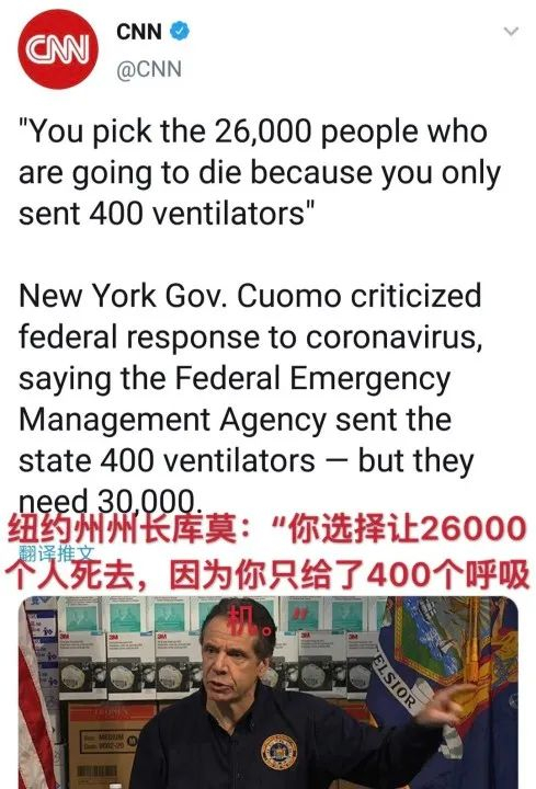 3月24日,库莫表达了对联邦紧急事务管理署的不满。不过,显然库莫被气到算错了数字,呼吸机的缺口应该是29600台,而非26000台。