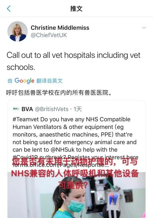 英国首席兽医Chrisine Middlemiss给致信全国所有注册兽医,求他们反馈各自所处机构的兽用呼吸设备清单,以备不时之需。
