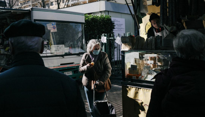 一位意大利老人戴着口罩前往集市购物 图片来源:nyt