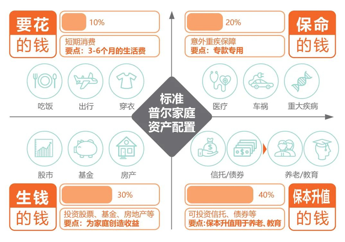 它把家庭资产按比例划分为如图所示的四个账户,通过合理的配置比例来分散风险。