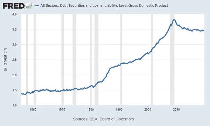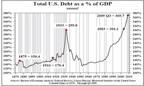 在大萧条之前,美国还积累了大量债务。从1929年开始,经济陷入衰退和萧条时,GDP下降,但债务仍在堆积,因此到1933年,债务与GDP的比率达到约300%的峰值。