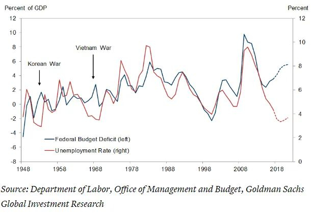 通常情况下,在经济扩张期间,美国政府会减少赤字,然后在衰退期间,美国政府会增加赤字,来刺激走出衰退。然而这一次,美国政府在经历了11年的经济扩张后陷入了危机,赤字每年扩大到1万亿美元,并不断上升,并在商业周期最高峰达到GDP的5%。尽管经济繁荣,我们却没有削减赤字,相反,在经济周期的最顶峰,我们却增加了赤字。这在除了战争之外是史无前例的: