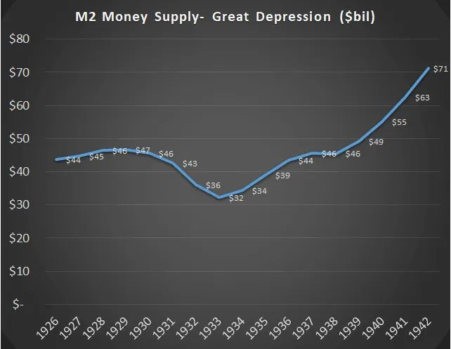当经济出现大规模崩溃时,超过三分之一的银行倒闭。流通中的实物货币总量保持相对平稳,差不多是40-50亿美元,但广义货币供应量(包括货币加支票和储蓄账户)下降了约30%。1929年,美国的广义货币供应量曾经接近470亿美元,到1933年下降到略高于320亿美元。