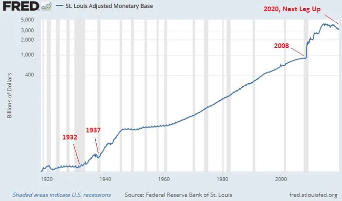 我们今天也有类似的情况。我们第一次大规模的货币基础扩张是在2008年到2014年,这可以和1932年以后的货币扩张进行镜像比对。然后,2014年到2019年货币连续几年保持平稳,并在2019年底开始扩张,然后由于2020年COVID-19病毒冲击下,加速增长。现在镜像了1937年的时刻——货币投放基础的下一个指数增长阶段。