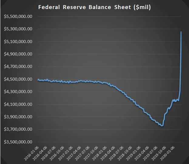 美联储陷入这场危机前时资产负债表约为4.5万亿美元,实际上美联储在2008年危机后资产负债表从未实现正常化。它可能需要将今年新发行的美国国债全部货币化(印刷和购买)。他目前每天无上限购买750亿美元的美国国债,每天购买500亿美元的抵押贷款证券。按照这个速度,这是1250亿美元每日,或约2.5万亿美元每月。下周,它计划将美国国债和抵押贷款证券的购买分别减少一点至600亿美元/天和400亿美元/天,即约2.0万亿美元/月。