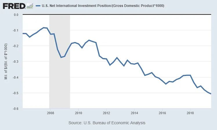 在2008年经济大衰退期间,我们的国际净资产额占美国国内生产总值的-10%,这是相当小的。自那以后,情况继续恶化,目前已超过GDP的-50%。我们是作为全球最大的债务国进入当下的衰退。我们从未进入过一场国际资产净头寸相对于GDP负比率如此之高的衰退。大萧条时期没有,09年的大衰退时期也没有。