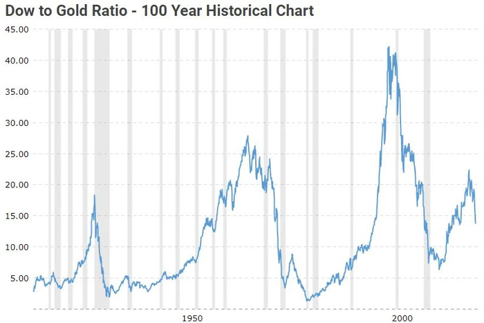 在包括股息和再投资在内的数十年内,股票的表现远远超过黄金。但在过去几年,甚至过去几十年的时间里,当道琼斯指数被高估和超买时,在周期的顶部,黄金的表现超过道琼斯指数。