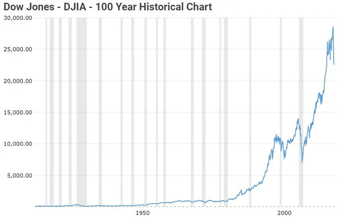 自从道琼斯工业平均指数(Dow Jones Industrial Average)成立以来,大多数投资者都是用美元来计量。以前指数不到100,现在在两万左右。这是一个世纪图表,不包括分红: