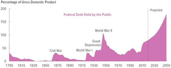 历史上唯一一次我们遇到类似问题是在第二次世界大战期间。我们在二战中所做的是,把国债收益率限制在2.5%,让通胀率上升到10%以上,从而实际上把债务给膨胀掉了,相对于占GDP的比例。当一个主权国家的债务水平达到GDP的100%以上时,几乎没有任何数学方法来实际偿还债务。要么违约,要么印钱。通常,政府会印钱。