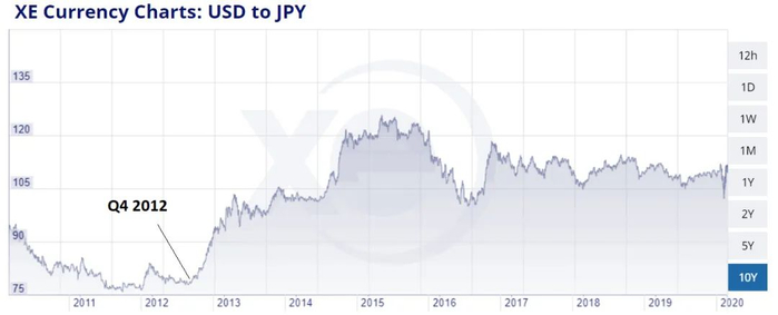 不过,这并不是说日经指数获得了很大的购买力。因为与此同时,日元兑美元(以及许多其他货币)迅速贬值: