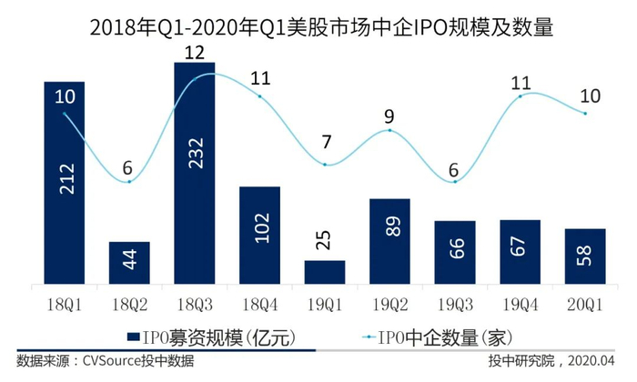 图表9 2018年Q1-2020年Q1 美股市场中企IPO规模及数量