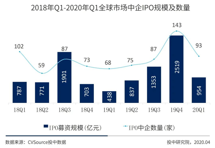 图表 2 2018年Q1-2020年3月Q1全球市场中企IPO规模及数量