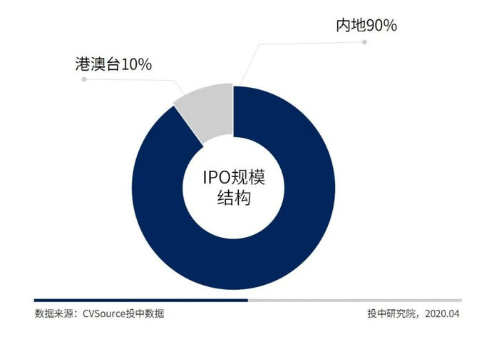 2020年Q1,前十大IPO项目集中在A股(科创企业占据5席),募资规模均在19亿元以上,占2020年Q1整体IPO募资57%,且与其余IPO项目的平均融资额呈现两极分化的态势。