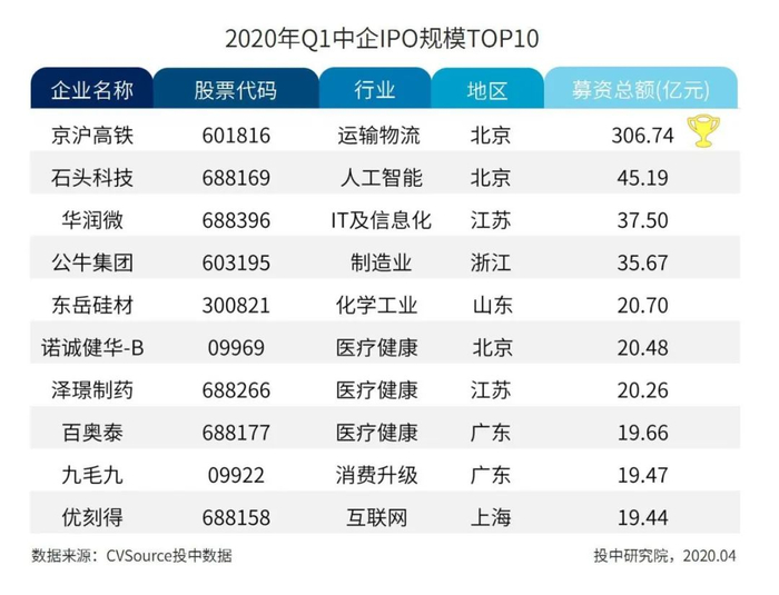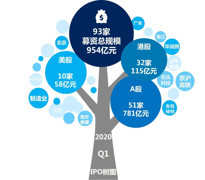 2020年Q1,共计有93家中国企业在A股、港股以及美股成功IPO,募资总额954亿元;IPO募资规模TOP5企业依次为京沪高铁、石头科技、华润微、公牛集团、东岳硅材;IPO集中行业为制造业;IPO集中地域为广东、北京、浙江。(见图表1)