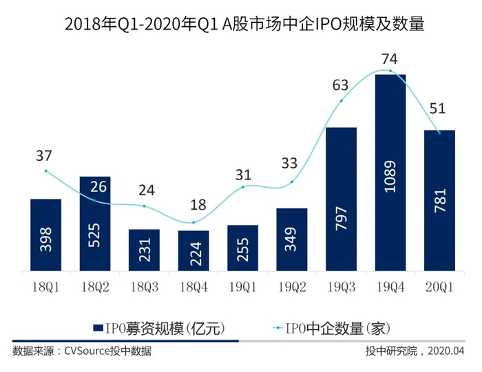 图表 3 2018年Q1-2020年Q1 A股市场中企IPO规模及数量