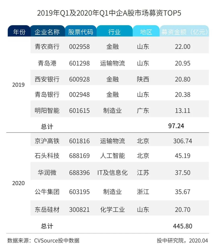 表格 1 2019年Q1及2020年Q1 中企A股市场募资TOP5