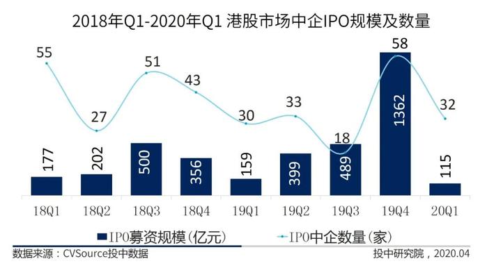 图表 5 2018年Q1-2020年Q1 港股市场中企IPO规模及数量