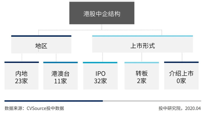 2020年Q1,港股共计发生34起中企上市案例,其中2起为转板案例,其它32起全部为IPO案例。按照IPO募资规模统计,内地中企IPO占主导地位,23家内地中企占港股市场全部IPO募资规模的90%。(见图表7、图表8)