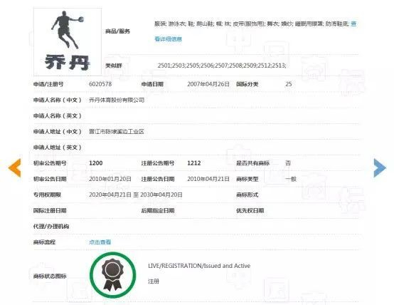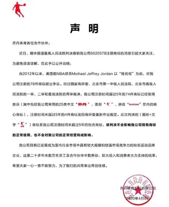4月8日,最高人民法院对乔丹体育的商标侵权案做出裁决:乔丹体育败诉,乔丹体育第25类服装鞋帽袜等商品上的6020578号“乔丹+图形”商标被撤,且这是终审判决。