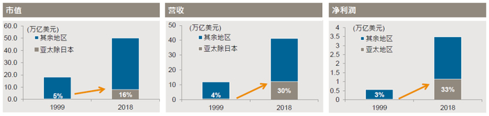 过去20年来,亚洲(除日本)市值在MSCI AC World指数的比重从1999年5%上升至2018年16%,同一时间,除日本外的亚洲上市公司的收入在全球的比重从4%增长至30%,盈利占全球公司盈利比重从3%显著上升至33%。这意味着市值比重的增长没有跟上盈利水平的增长。