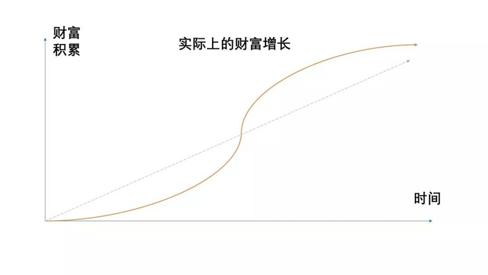 很多人并不是不懂这个道理,但问题在于无法忍受寂寞,因为财富的增长并不是前面那条向上的斜线,而是抛物线的组合,前半生慢,中间有一段突破瓶劲后很快,最后又遇上瓶颈慢下来。