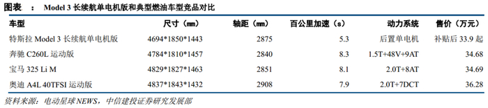 裘伯元认为:“特斯拉长续航版Model 3 668km的续航里程,打消了很多里程焦虑车主的顾虑,对开拓新能源汽车市场的天花板肯定是有利的。对市场份额的竞争上,34万价格的长续航版Model 3更多的会侵蚀BBA(奔驰、宝马、奥迪)的市场,对应国内合资车企将受到影响。”乘联会统计显示,3月高端轿车销量榜单上,特斯拉Model 3凭借10160辆的销量位居榜首,宝马5系、奥迪A6、奔驰C级等奔宝奥主流车型屈居其后。但以宝马3系、奥迪A4L、奔驰C260L为例,性能上明显的差距体现在百公里加速上,包括外观、内饰、品牌等也有一定的差异,尽管Model 3在综合来看尚不如前者,但续航里程得到提升后,无疑在竞争力上得到质的提升。考虑此前标准版Model3销量已经可以与BBA车型媲美,未来限制国产特斯拉销量的大概率将是上海工厂的产能因素,至少短期来看处于一个供不应求的状态。
