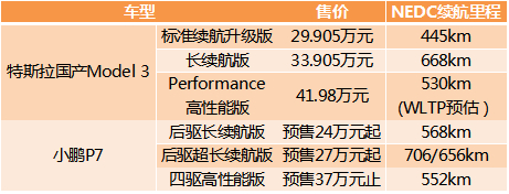 表:Model 3长续航版与小鹏P7对比情况