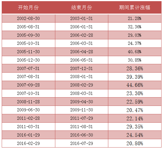 如果将考察时间拉长至连续12个月,则最大涨幅区间出现在2005年6月至2006年5月,区间上涨超过54%。其中2006、2008、2009和2011年均出现了连续12个月累计上涨超过40%的投资机会。