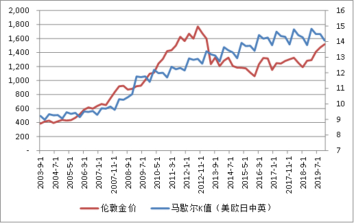 我们以美欧日中英五个地区的M2值和GDP数据计算马歇尔K值,以其作为衡量全球流动性主要趋势的指标。从下图中我们可以发现,金价会伴随着全球流动性水平的持续增长而水涨船高。