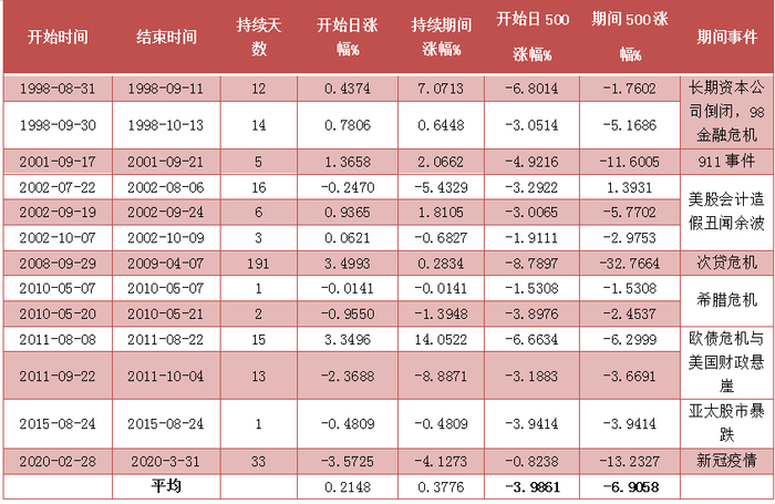 我们使用1990年至2020年3月VIX指数收盘行情为观测值,VIX指数突破40共取得样本188个,前后两个样本间隔日期10日内(包含)则视为此次事件仍在持续,据此可获得13次事件冲击(注:2020年2月28日当日持续至今,为便于统计令结束日期等于3月31日),计算期间伦敦金价和标普500涨跌幅如下: