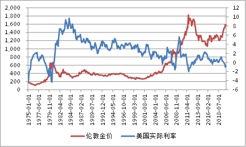 图1:伦敦金价和美国实际利率(扣除CPI的10年期国债收益率)(1975.01-2020.03)