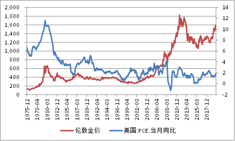 图4:伦敦金价和美国个人消费支出价格指数(PCE)(1975.12-2020.02)