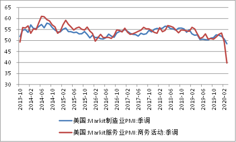 PMI是一个先行指标,可敏感反映社会经济状况的变化。学术界一般认为:PMI指数50为荣枯分水线。当PMI大于50时,说明经济在发展,当PMI小于50时,说明经济在衰退。此番受新冠疫情影响,美国制造业PMI和服务业PMI数据迅速恶化,尤其是服务业PMI已经连续两个月跌破荣枯线。