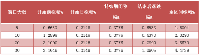 以窗口期为30天为例,开始日-31至开始日-1日平均涨幅为3.1646%,结束日+1至结束日+31日平均涨幅为1.0905%,开始日-31至结束日+31日平均涨幅为4.4739%。