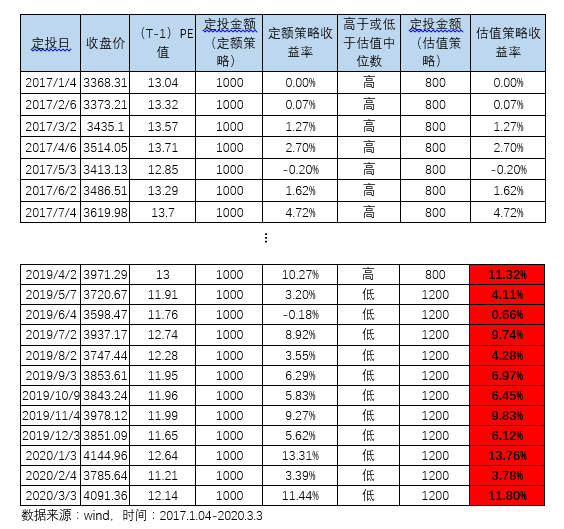 接下来我们分别采取定额策略和估值策略进行投资,从2017年1月开始,每月的第二个交易日定投1000元。如估值高于中位数,则我们减少200元,低于则加投200元。不计算交易摩擦成本。