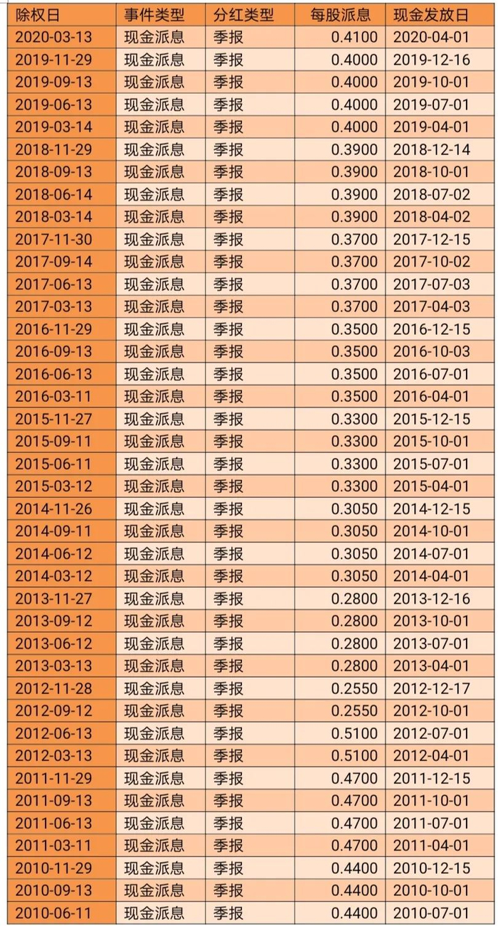 表3:可口可乐最近10年分红派息数据(季报、中报、年报、不定期)(注:单位:USD)