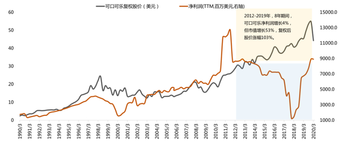 图2:可口可乐长期的股价与净利润自2012年后发生背离