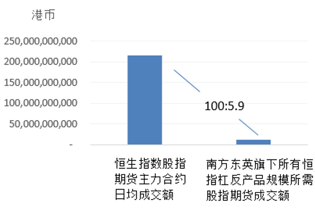 恒指期货交易额 vs. 南方东英恒指杠反产品规模所需股指期货成交额