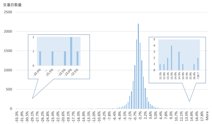 一般我们说恒指单日跌幅超过50%的机会很小,但是又多小呢?从恒生指数发布交易至今,每日平均波动率在1.82%,根据分布的结果,大概是这样的: