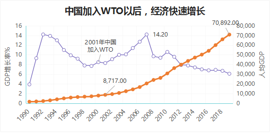 回过头来看,2001年贵州茅台在上海证券交易所上市的同时,另外一个非常重要的事件是中国加入WTO。WTO进一步将中国纳入世界分工体系,为此后数十年中国经济发展提供了源源不断的动力。如在加入WTO以后的2002-2011年间,中国GDP平均增长率达到10.68%,经济进入快速增长期。