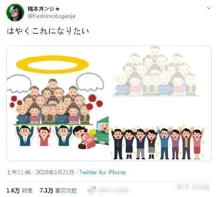 漫画了说点啥呢?左边身处养老压力下的日本年轻人正在负重前行。右边新冠爆发了,越来越多老年人升天,年轻人如获新生,脸上露出轻松愉快的笑容。