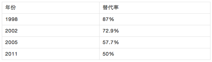 可以看出近年来替代率持续下滑,近七、八年代替率基本稳定在45%左右。