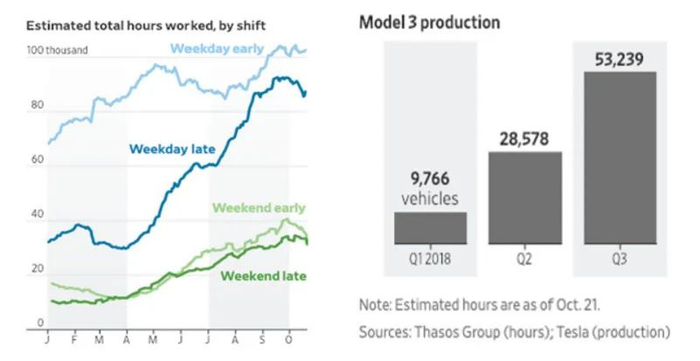他们在一张在线地图上环绕 Tesla 位于 Fremont,California 的占地 370 英亩的工厂,创建了一个数字围栏,以隔离从 Tesla 工厂范围内发出的智能手机位置信号。Thasos 租赁了数不胜数的智能手机 APP 收集到的数万亿个地理坐标的数据库,并通过电脑程序密切监测从 Tesla 工厂中发出的手机信号。使用手机信号量进行估计,他们发现从 2018 年 6 月到 10 月,Tesla 工厂夜间轮班时间增加了 30%。