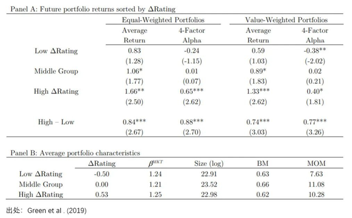 为了研究员工评价和股票收益率的关系,Green et al. (2019) 依据员工评价变化高低将股票分为三组(top 20%,middle 60%,bottom 20%),并用 high – low 构建了因子。理论上,员工评价变高,意味着经济环境及公司前景很可能在变好,在其他条件相同的情况下,公司应有更好的表现,因此预期收益率更高。实证结果支持了他们的猜想。
