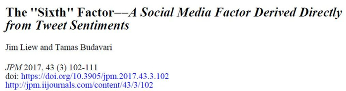 同样作为研究网络舆情数据的研究,Liew and Budavari (2017) 这篇文章使用 tweet sentiments 数据,在 Fama and French (2015) 五因子基础上加入了第六个因子,指出该因子能在五因子之外解释个股收益率的时序波动。不过有意思的是,该文并没有研究该因子在解释个股预期收益率截面差异上的作用,所以 read/use with care……