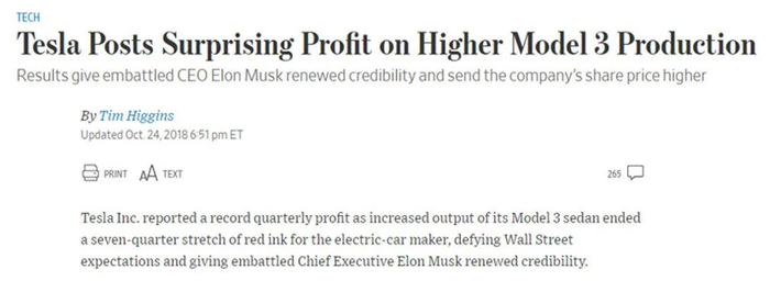美国时间 2018 年 10 月 25 日,困境中的特斯拉(Tesla)股票录得 9.14% 的大涨,只因为在前一个交易日盘后发布的 2018 Q3 财报大超华尔街预期。财报显示,爆款 Model 3 的产量在过去一个季度较之前几乎翻番,这无疑给了投资人注入了一剂强心针,也引得市场一片狂欢。