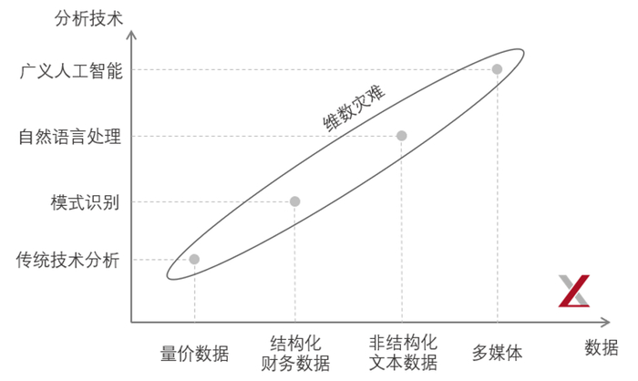关于另类数据的第一个思考是新的数据类型需要相应的分析技术。当我们仅有量、价数据的时候,传统的技术分析,如均线、布林带就能发挥很大的作用。然而,这些技术分析对结构化的会计报表数据却难有作为。为此,相应的分析手段也应运而生,比如多因子模型等。而如今,如果想要分析非结构化文本数据以及更 general 的多媒体数据,则更是需要相应的技术,如自然语言处理和广义人工智能。显然,这对管理人和投资者都提出了越来越高的要求。