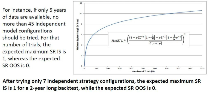 下图结果来自 Bailey and Lopez de Prado (2012) 的研究。假设数据无法预测收益率,该研究发现,如果数据的长度仅有 2 年,则仅需要通过 7 个检验就能找到夏普率为 1 的策略;而如果数据的长度提高到 5 年,达到同样的效果则需要 45 个检验 —— 其实也非常很容易。
