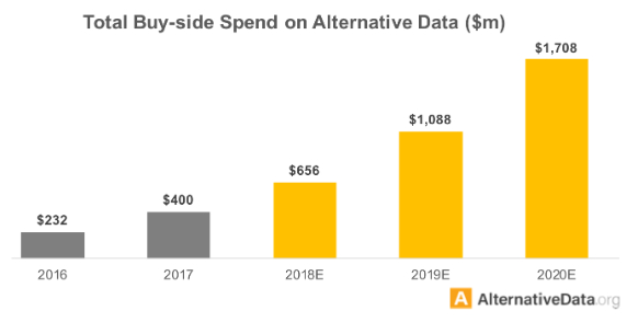 读到这里有小伙伴也许会问“你这题目文章叫前景和陷阱,这前面 blabla 说了五点都是陷阱啊,前景在哪里?”其实,把坑都填上、科学的使用再加之正确的预期,那么这些“陷阱”就将变成“前景”。据来自 AlternativeData.org 的统计数据显示,海外买方在购买另类数据上的支出在最近几年逐年增长。